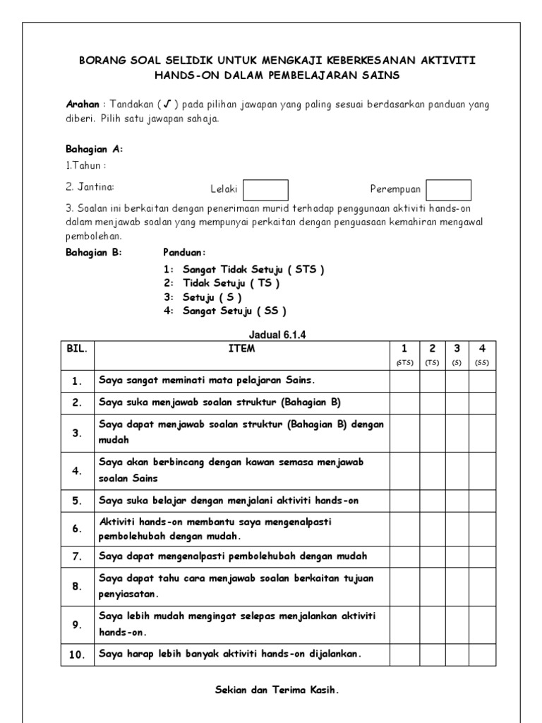 2 from ( ) lelaki ( ) perempuan 2) umur report borang soal selidik. Universiti teknologi malaysia borang pengesahan.borang soal selidik yang terbahagi kepada 3 bahagian. Individu yang membina borang soal selidik ini perlulah berpengetahuan luas agar soalan yang dibina adalah wajar, boleh dipercayai dan tidak dipengaruhi emosi. Savesave borang soal selidik for later. Respon pelajar terhadap pengajaran guru bahagian a: If you want to learn soal selidik in english, you will find the translation here, along with other translations from malay to english. 0 ratings0% found this document useful (0 votes). Koperatif dalam pembelajaran dan pengajaran sains d.