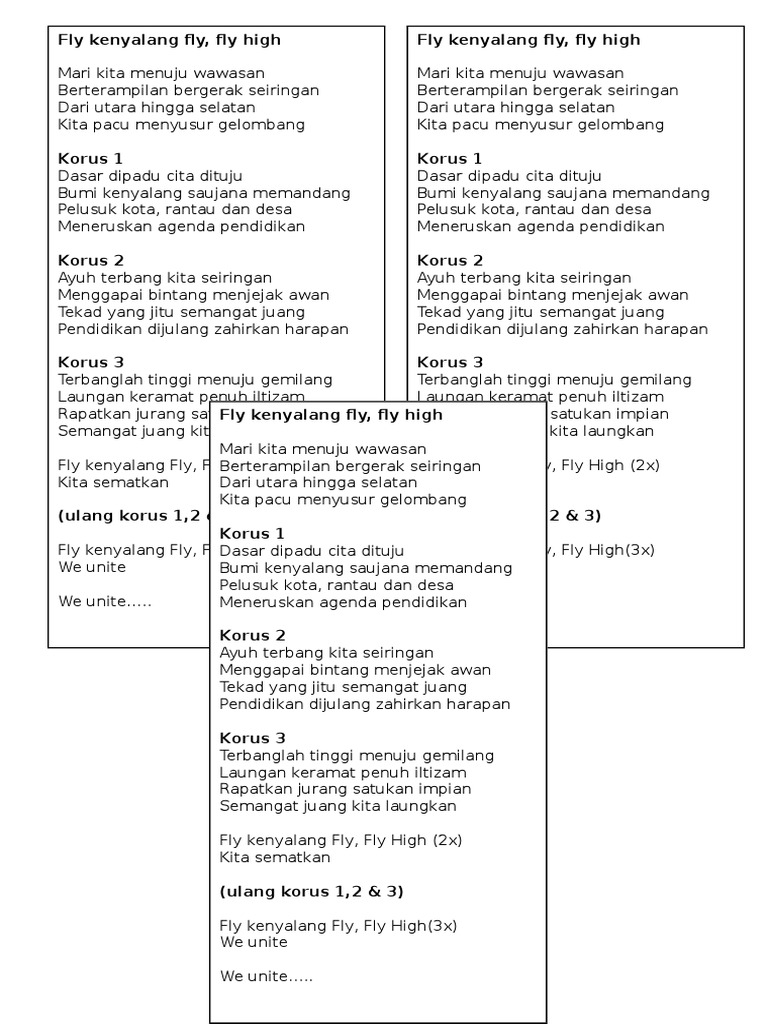 Lirik Lagu Fly Kenyalang Fly : Lirik Lagu Learn To Fly : A1 / Mari kita menuju wawasan berterampilan bergerak seiringan dari utara hingga selatan kita pacu menyusur gelombang *dasar dipadu cita dituju bumi kenyalang saujana memandang pelusuk kota.
