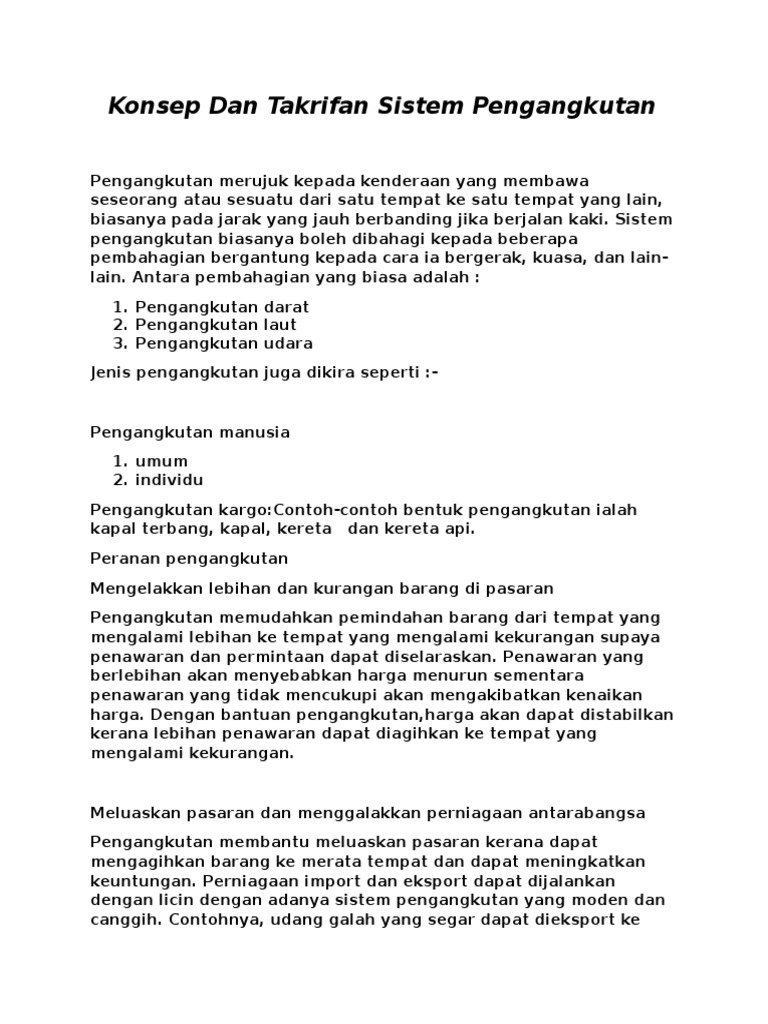For more information and source,. Oct 30, 2020 · contoh takrifan dan konsep sistem pengangkutan pt3. Menurut wikipedia, pengangkutan adalah merujuk kepada kenderaan yang membawa seseorang atau sesuatu dari satu tempat ke satu tempat yang lain, biasanya pada jarak yang jauh berbanding jika berjalan kaki. More images for konsep dan takrifan pengangkutan awam » Konsep dan takrifan sistem pengangkutan.